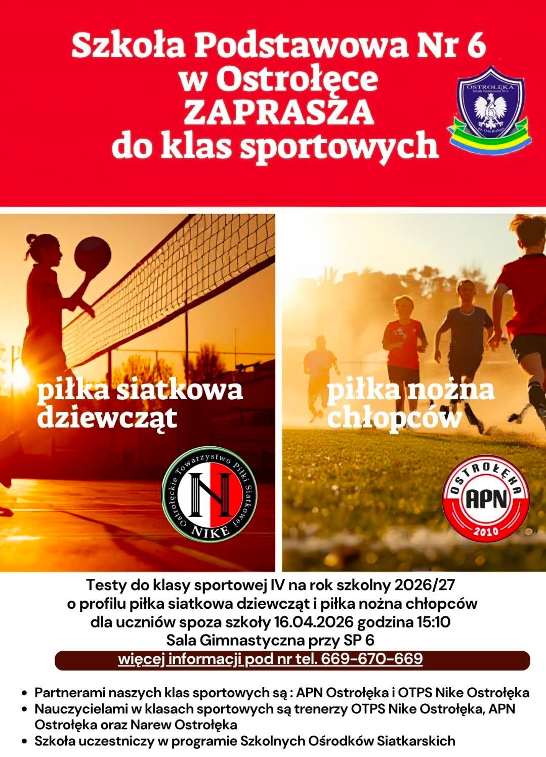 Uprzejmie informujemy, że rozpoczęła się rekrutacja do IV klasy sportowej na rok szkolny 2026/27. Podania do klasy sportowej należy składać do sekretariatu szkoły. Testy sprawnościowe zostaną przeprowadzone w dniach 13-15.04.2026 r. Próby sprawnościowe dla uczniów spoza naszej szkoły odbędą się w dniu 16.04.2026 o godzinie 15:10 na sali gimnastycznej. Wszystkie informacje oraz załączniki znajdą Państwo na stronie internetowej w zakładce Rekrutacja – Rekrutacja do klasy sportowej. Jeżeli potrzebują Państwo więcej informacji można również dzwonić na numer telefonu 669-670-669.
